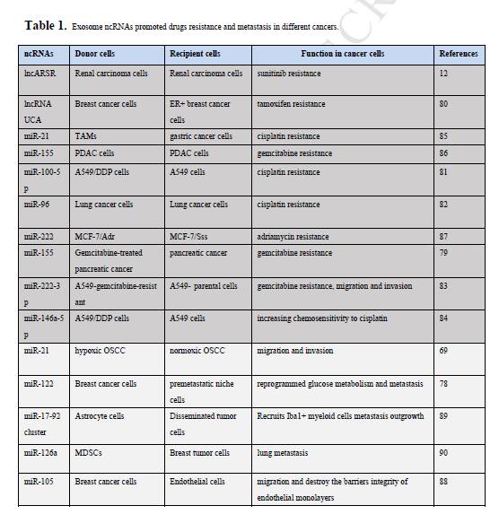 外泌體內的核酸包括DNA與RNA。在靶細胞內起作用的主要是RNA,外泌體內的RNA主要包括mRNA,microRNA,ncRNA,其中microRNA屬于功能性RNA,他可以調節細胞內RNA和蛋白的水平,從而影響細胞的形態(tài)和功能。因此,microRNA是外泌體中研究最廣泛最深入的RNA,且這些外泌體中的RNA往往與疾病的發(fā)生與發(fā)展有關(guān)。下表中介紹了許多與疾病有關(guān)的外泌體lncRNA和microRNA。