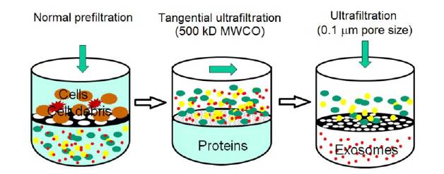 一開(kāi)始通過(guò)大孔徑濾膜濾掉細胞,再通過(guò)小孔徑濾膜濾掉蛋白等雜質(zhì),最后通過(guò)0.1um的孔過(guò)濾,得到外泌體