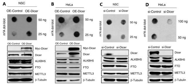 (1)Dicer敲低使m6A水平下降,dicer過(guò)表達使m6A水平上升。