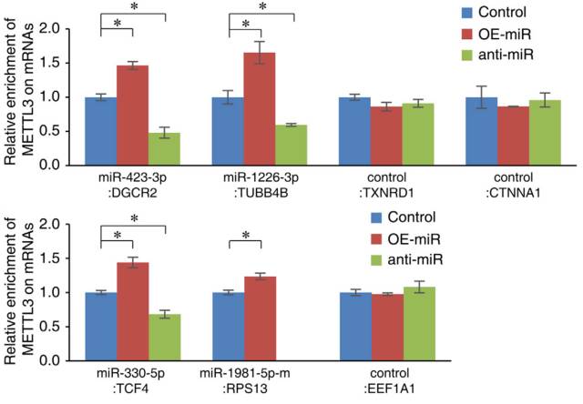 接著(zhù)為了更直接的說(shuō)明microRNA對METTL3和mRNA結合的影響,作者通過(guò)METTL3的RIP-QPCR檢測microRNA過(guò)表達后mRNA與METTL3的結合,說(shuō)明microRNA對METTL3與mRNA的結合具有促進(jìn)作用。如下圖: