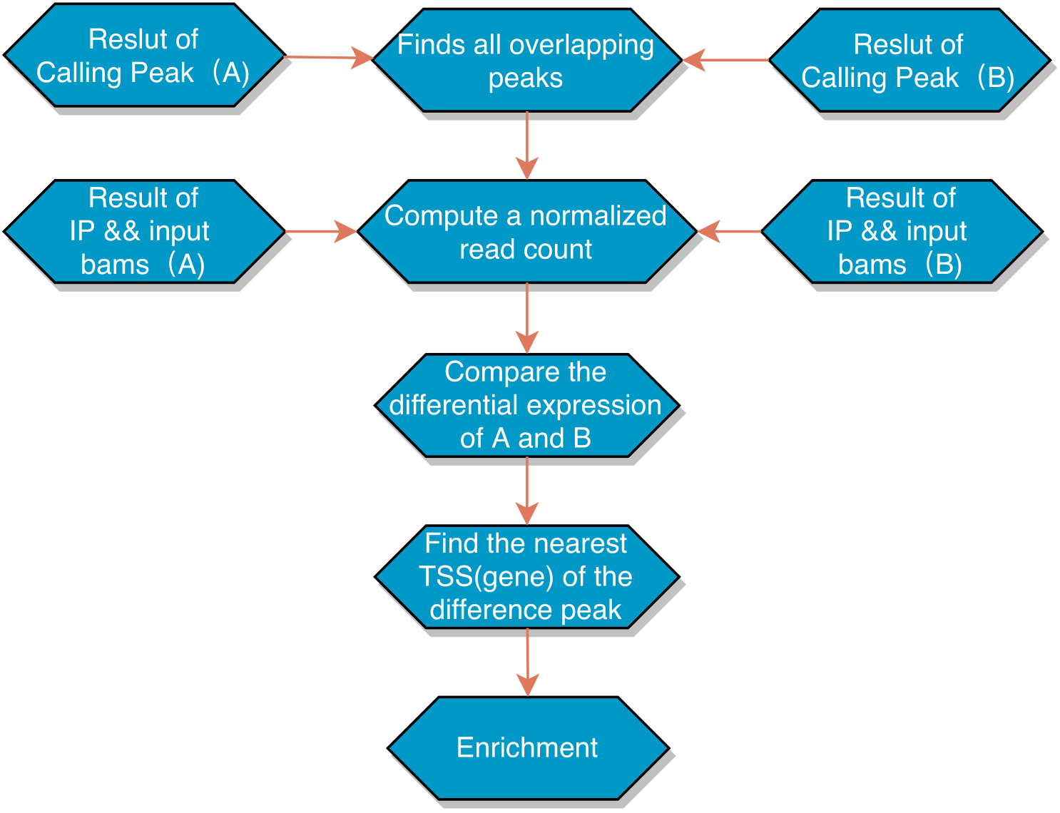 ??為了理解細胞中更為復雜的生物過(guò)程,許多研究已在通過(guò)比較ChIP-seq的差異獲得的不同數據。越來(lái)越多的ChIP-seq實(shí)驗正在研究多種實(shí)驗條件(例如各種治療條件,幾個(gè)不同的時(shí)間點(diǎn)和不同的治療劑量水平)下的轉錄因子結合,組蛋白修飾的差異。差異富集在生物學(xué)和醫學(xué)研究中已變得具有實(shí)際重要性。 為了建立對比條件消除誤差,我們對數據進(jìn)行了以下流程處理:我們首先將A與B兩組的結果進(jìn)行共有Peak區域基因計算,對于有共有區域(overlap)的Peak,計算最高峰位點(diǎn)并向其兩側各延伸250bp作為合并峰計算區域,對每個(gè)區域進(jìn)行的每組樣本進(jìn)行reads表達定量,進(jìn)行差異Peak的計算,篩選出差異Peak,進(jìn)行臨近3K注釋到基因上,進(jìn)行基因集富集分析。