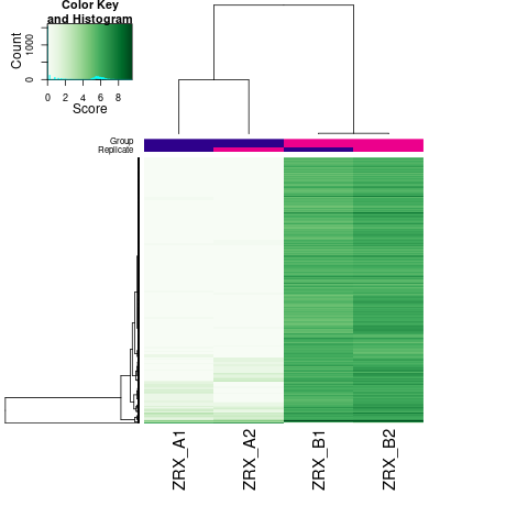 ??我們選取至少含有overlap區域>=2個(gè)樣本的callPeak區域結果,計算最高峰位點(diǎn)并向其兩側各延伸250bp作為合并峰計算區域,對每個(gè)區域每組樣本進(jìn)行reads表達定量。 隨后,我們對各組進(jìn)行readsCount的相關(guān)性熱圖分析,PCA分析。