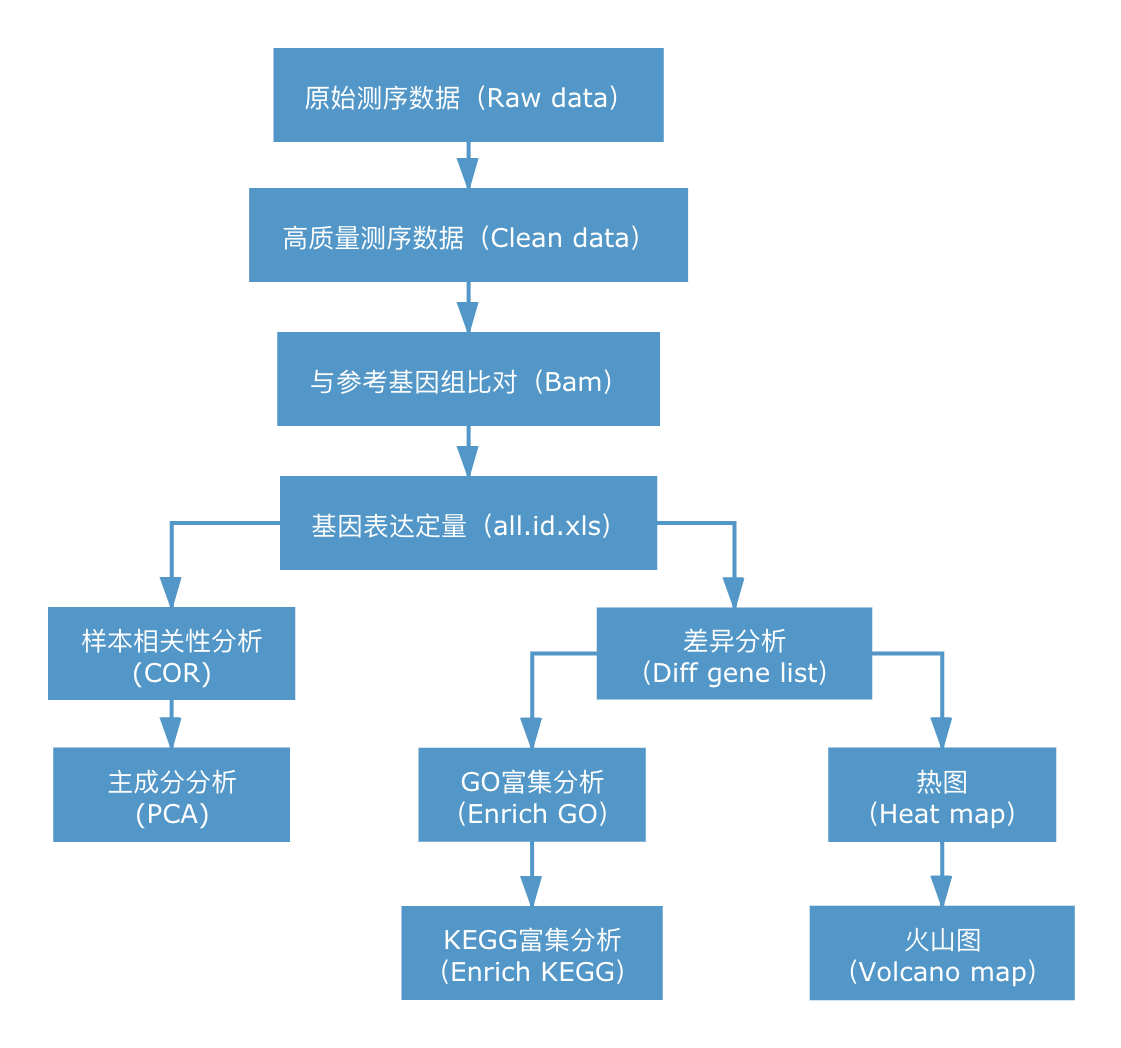??RNA-seq的核心是基因表達差異的顯著(zhù)性分析,使用統計學(xué)方法,比較兩個(gè)條件或多個(gè)條件下的基因表達差異,從中找出與條件相關(guān)的特異性基因,然后進(jìn)一步分析這些特異性基因的生物學(xué)意義,分析過(guò)程包括質(zhì)控、比對、定量、差異顯著(zhù)性分析、功能富集等環(huán)節。信息分析流程如下圖所示: