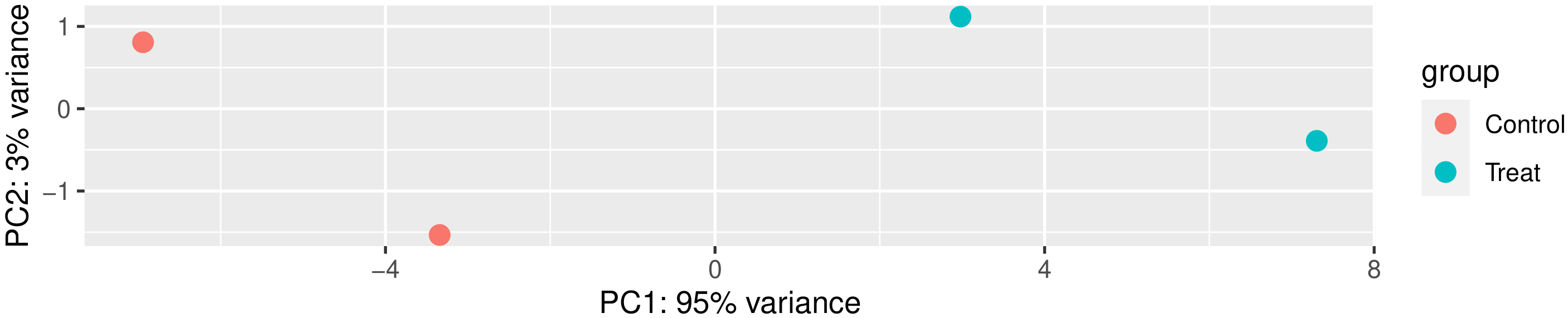 ??主成分分析(PCA)也常用來(lái)評估組間差異及組內樣本重復情況,PCA采用線(xiàn)性代數的計算方法,對數以萬(wàn)計的基因變量進(jìn)行降維及主成分提取。我們對所有樣本的基因表達值進(jìn)行PCA分析,如下圖所示。理想條件下,PCA圖中,組間樣本應該分散,組內樣本應該聚在一起。