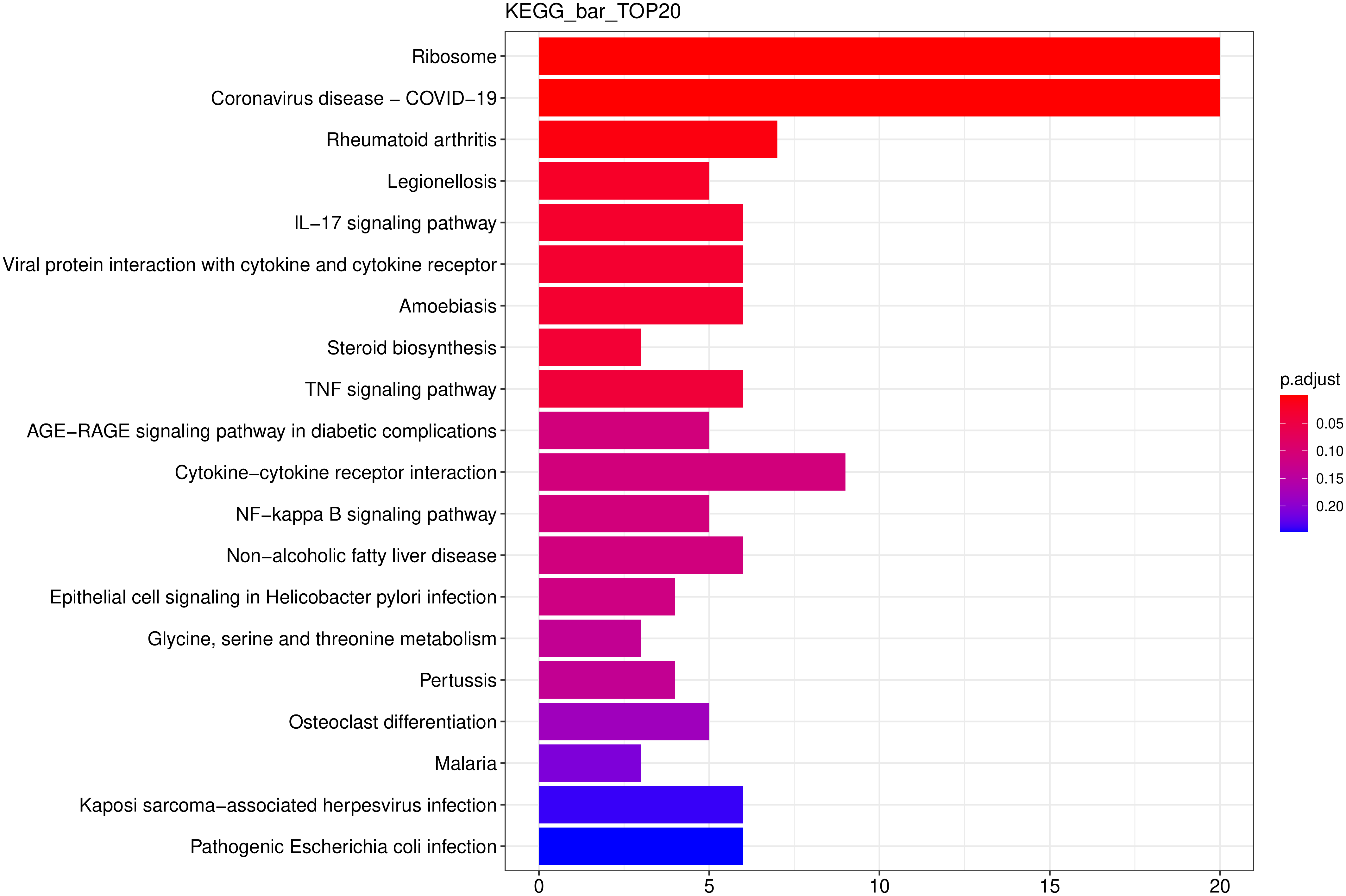 ??從KEGG富集結果中,選取最顯著(zhù)的20個(gè)KEGG通路繪制柱狀圖進(jìn)行展示,若不足20個(gè),則繪制所有通路,如下圖所示。圖中橫坐標為通路富集的顯著(zhù)性水平,數值越高越顯著(zhù),縱坐標為KEGG通路。
