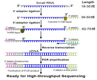 ??文庫構建:Total RNA PEG (polyethylene glycol)沉淀,連接3’接頭,PAGE (polyacrylamide gel electrophoresis) 膠分離回收,連接5’接頭,反轉錄,PCR擴增,文庫切膠回收。