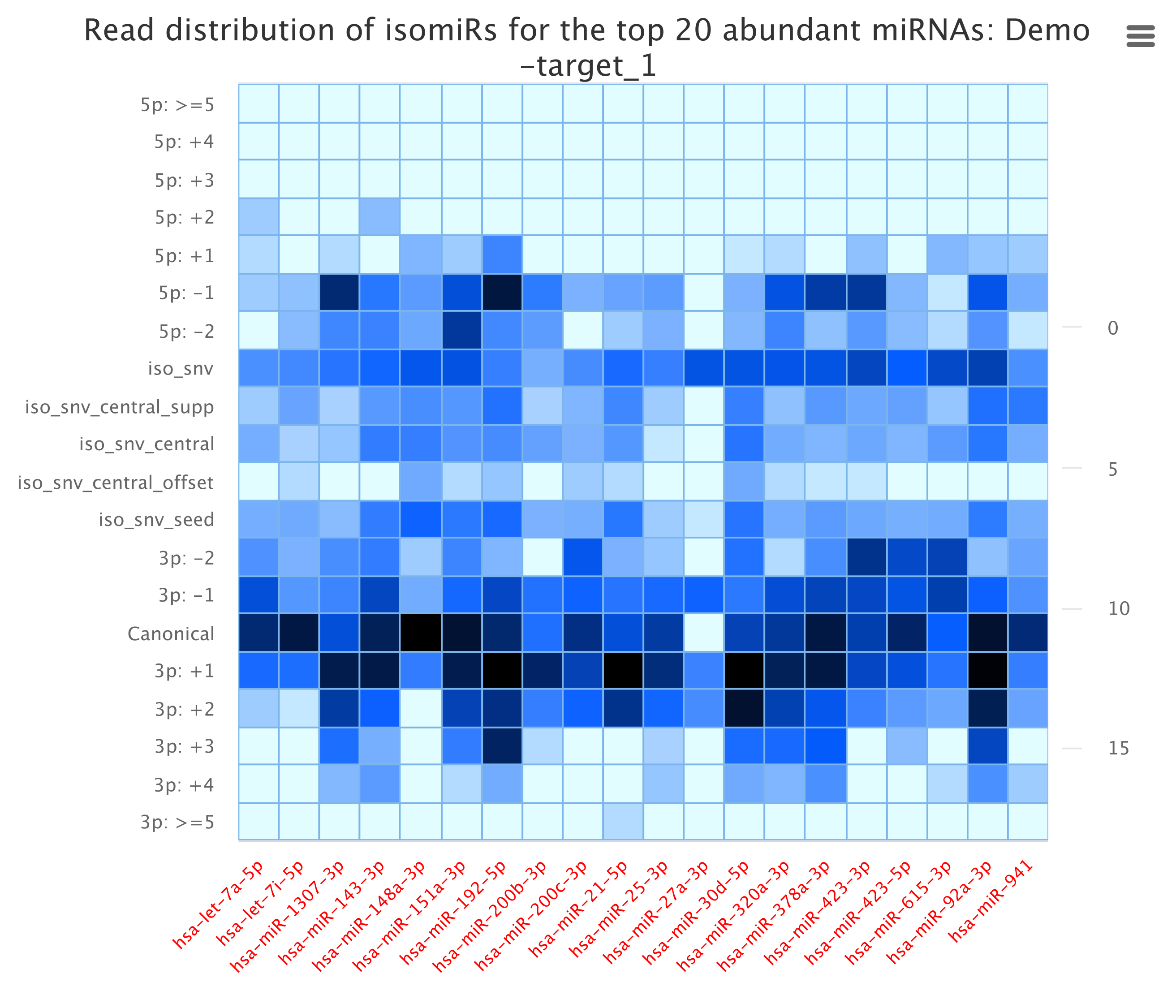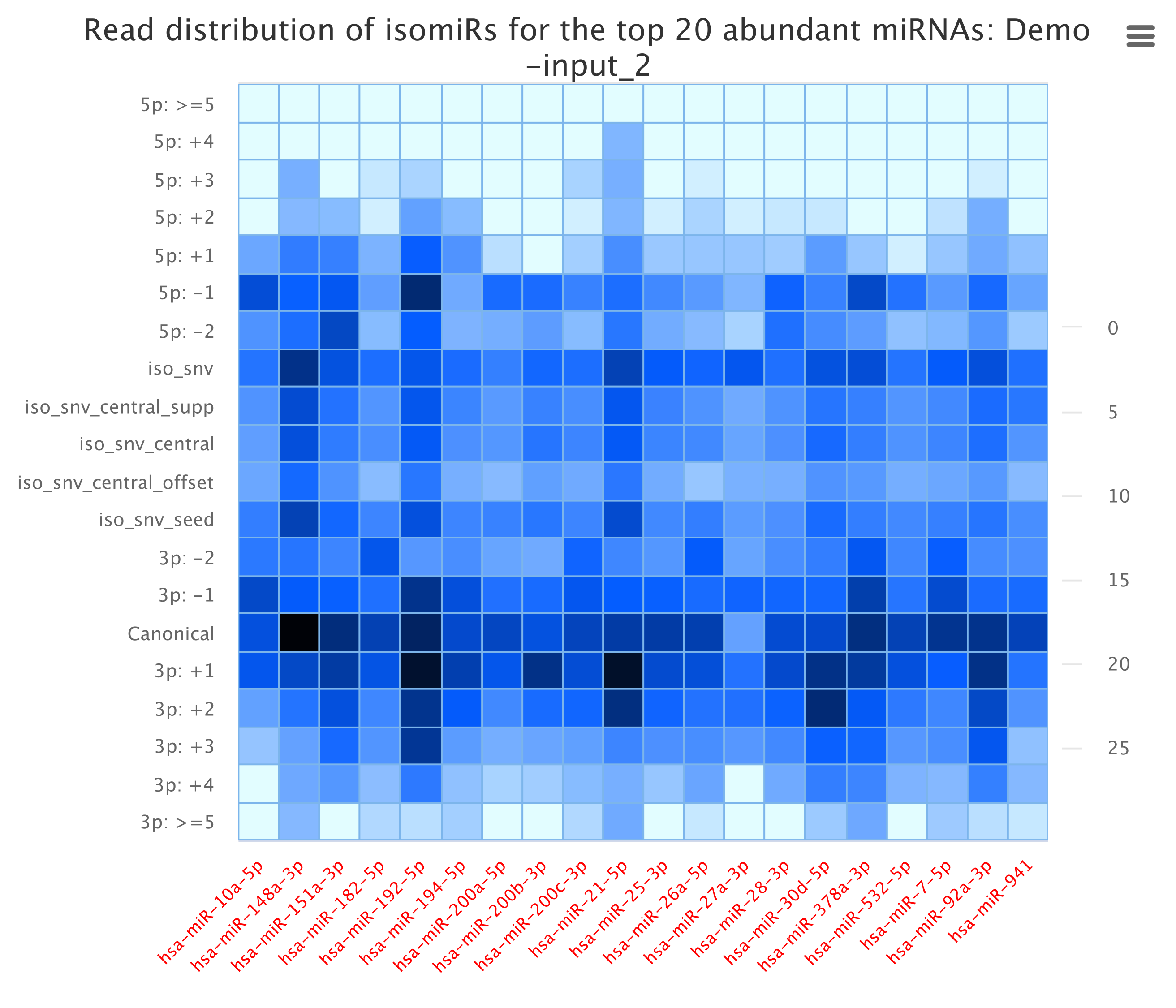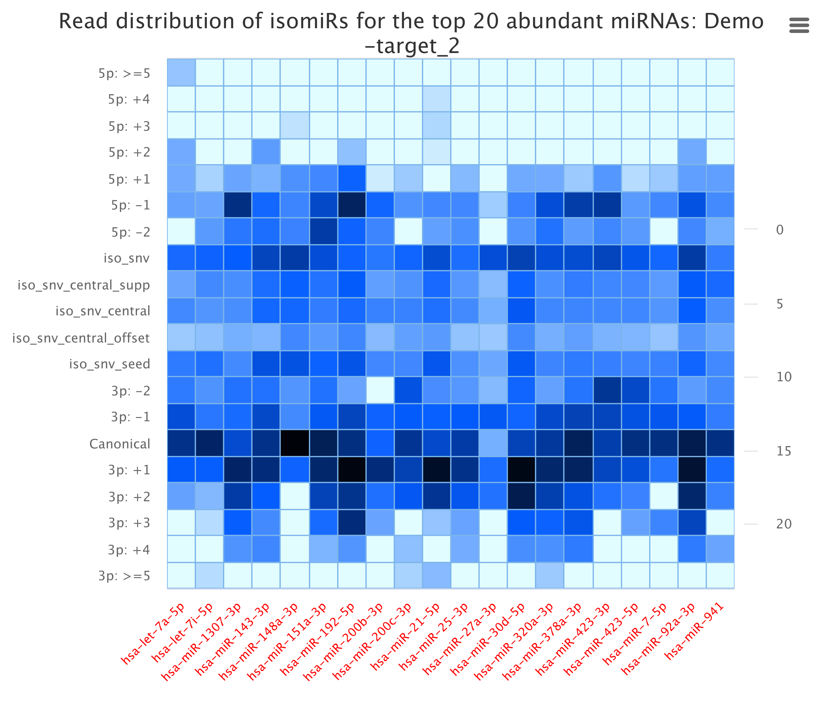 ??我們通過(guò)序列與miRbase比對的情況,將各個(gè)miRNA Reads進(jìn)行isomiR識別,并同時(shí)匯總至miRNA reads 注釋結果中,分類(lèi)統計,并選取表達量較高的前20個(gè)mirna進(jìn)行各類(lèi)IsomiRs表達豐度統計。