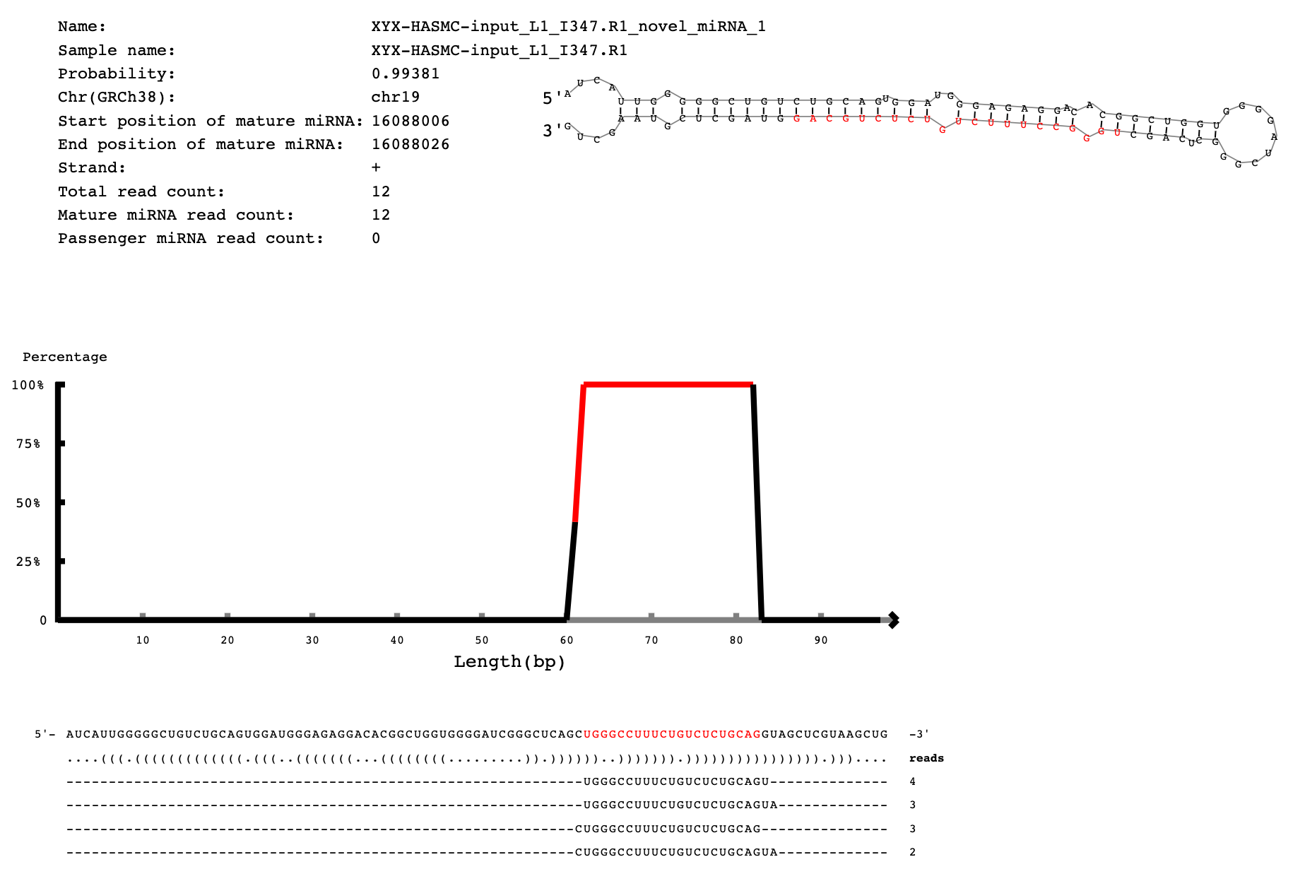 ??miRge根據序列特征,堿基配對原則,最小自由能等特征模型,進(jìn)行新穎的miRNA及二級結構預測。預測示意圖如下。結果見(jiàn):02.miRNA/3.novel_predict/