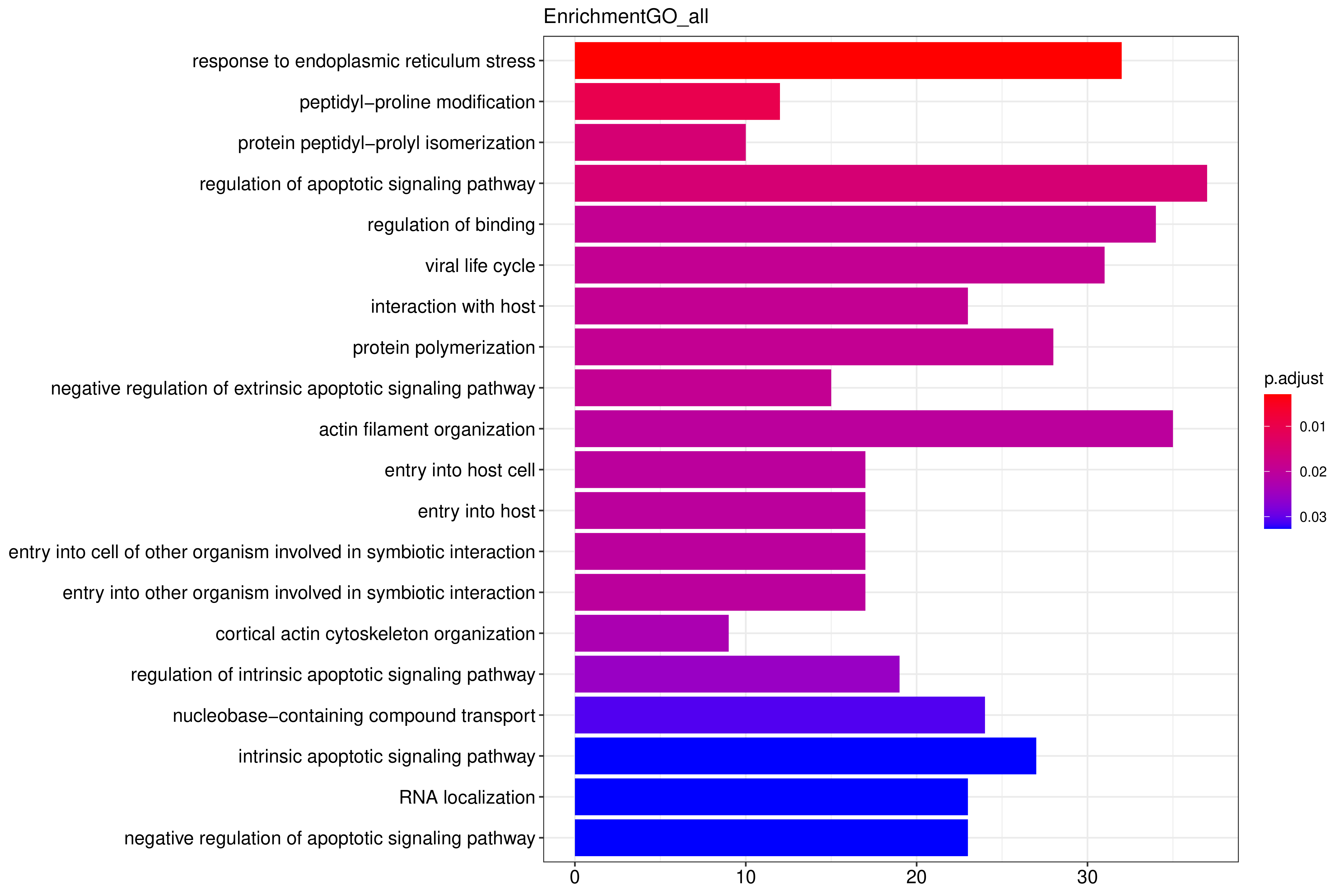 ??條形圖縱坐標為GO Term,縱坐標為count數,顏色從紅到紫代表富集的顯著(zhù)性大小。