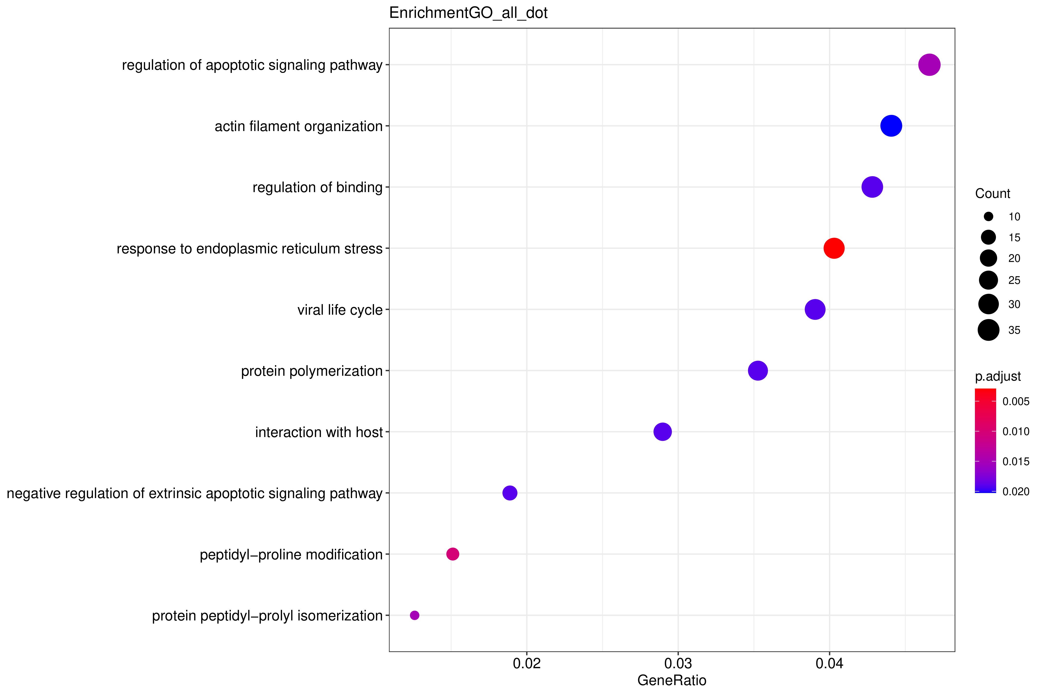 ??氣泡圖縱坐標為GO Term,點(diǎn)的大小代表注釋到GO Term上的基因數,顏色從紅到紫代表富集的顯著(zhù)性大小