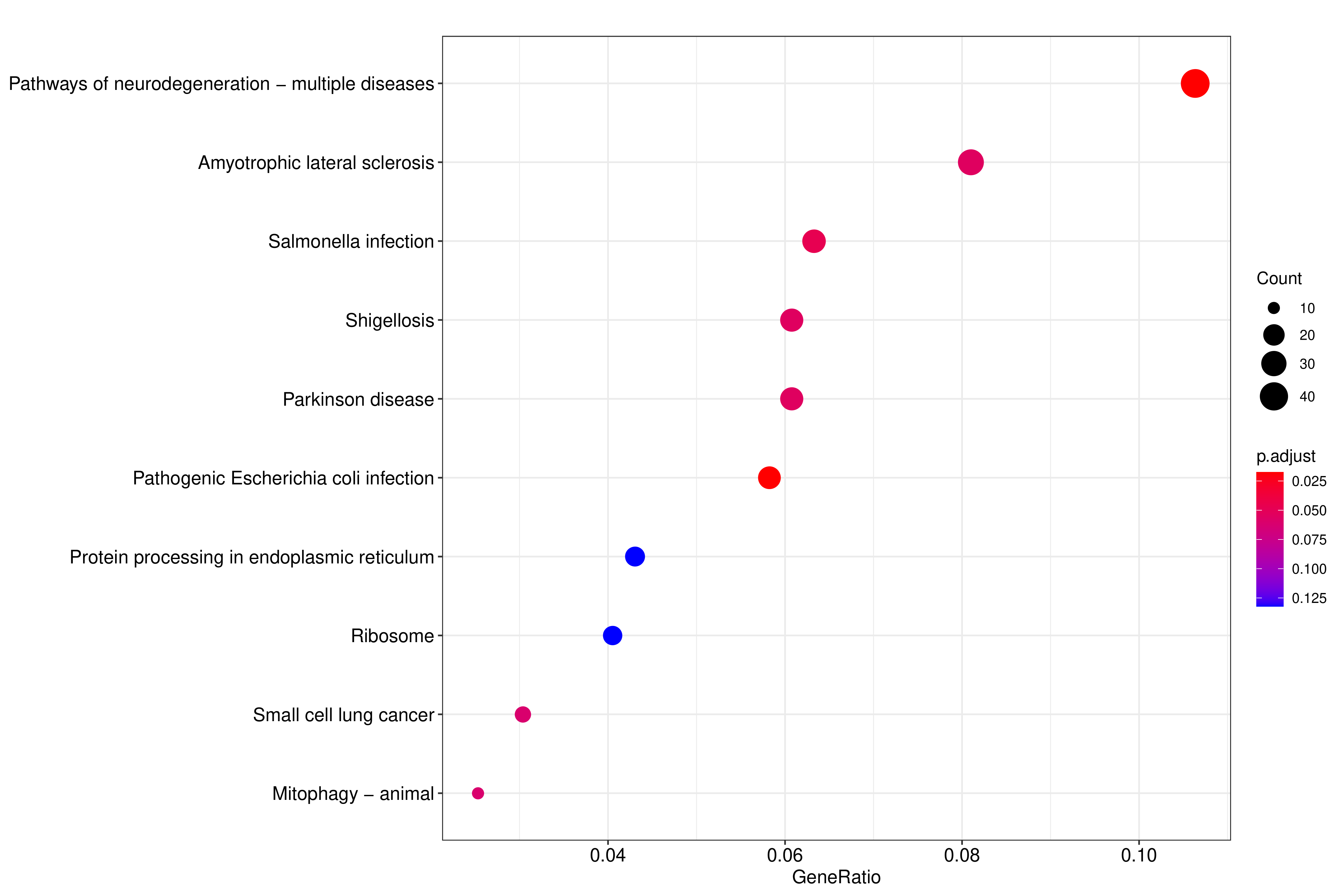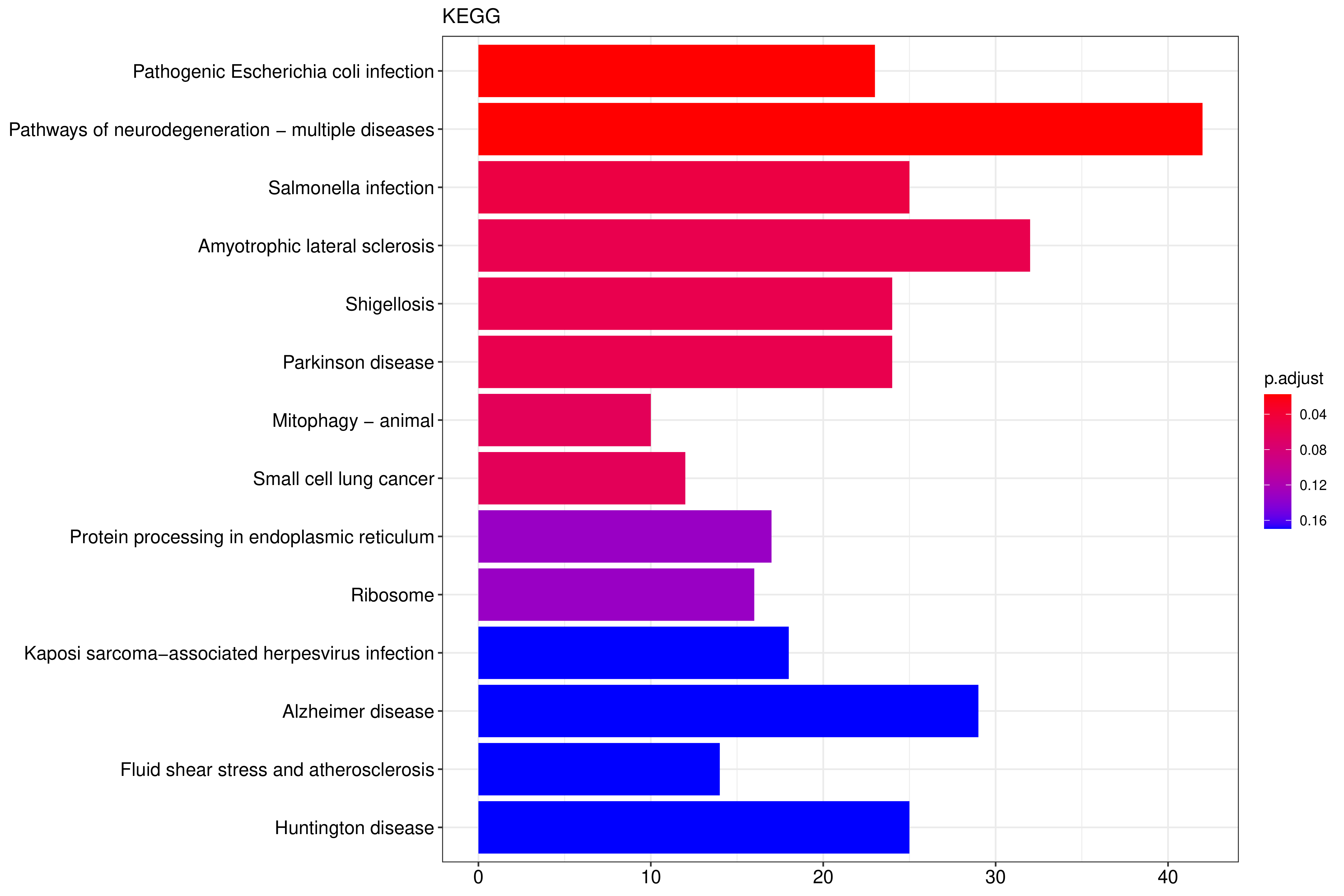 ??KEGG(Kyoto Encyclopedia of Genes and Genomes)是整合了基因組、化學(xué)和系統功能信息的綜合性數據庫。KEGG通路富集以padj小于0.05作為顯著(zhù)性富集的閾值,富集結果如下表所示,見(jiàn)結果文件:Enrichment/KEGG。 ?從KEGG富集結果中,選取最顯著(zhù)的20個(gè)KEGG通路繪制柱狀圖進(jìn)行展示,若不足20個(gè),則繪制所有通路,如下圖所示。圖中橫坐標為KEGG通路,縱坐標為通路富集的顯著(zhù)性水平,數值越高越顯著(zhù)。